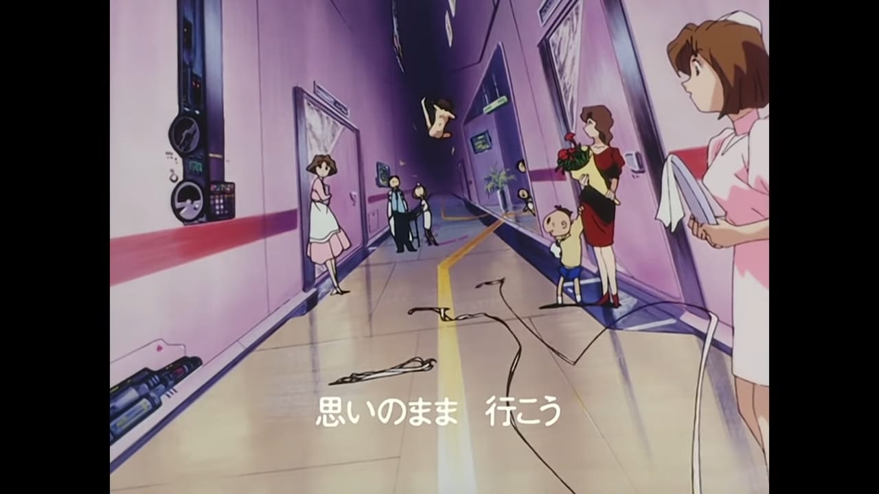 To be honest, I’m surprised I waited so long to see Irresponsible Captain Tylor. My college anime club screened it every year. I think I saw the first episode of the series, but somehow missed out on the rest. The opening credits sequence stuck with me, though. It’s bookended by Tylor, the protagonist, walking a tightrope through the sky to a big floating heart. The first time he falls and is hospitalized. By the end of the credits he’s back walking that rope with the friends he met along the way. Meanwhile, live-action footage of the vocalist is superimposed over footage of spaceships and explosions. It’s very much of its time but remains striking today.