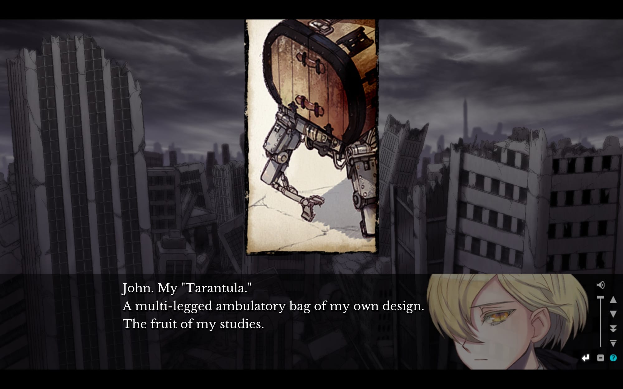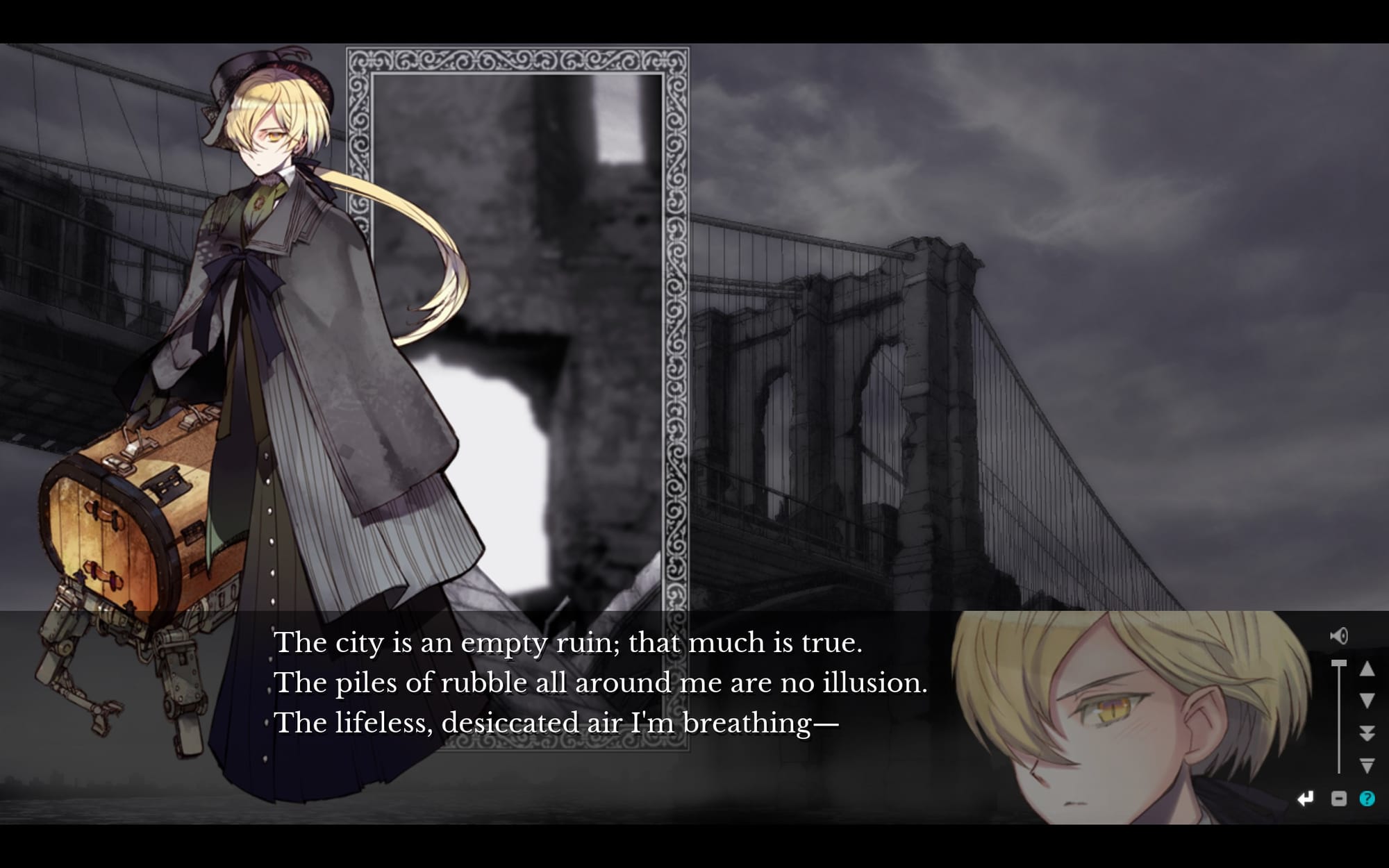koestl: I translated another game in the Steampunk series (Gahkthun) a few years before working on this project, so I had some experience working with the challenging prose style Sakurai employs in it. The writing in these games demands some real creativity from both translators and editors due to a heavy use of repetition and poetic rhythm. I think ten different translators would probably produce ten very different takes on a script like this, but I tried my best to develop consistent voices for the characters and capture the distinctive flow of the narration.